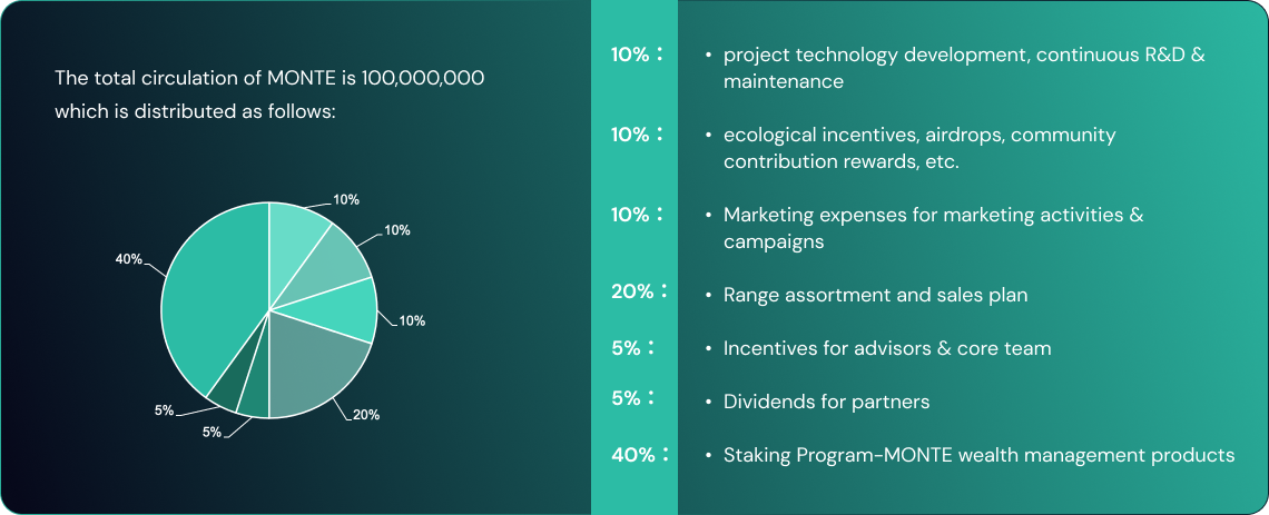 MONTE implements a decentralized public distribution method based on on-chain protocols. In terms of governance and construction, the development and construction of the ecology is all controlled by the MONTE DAO (a decentralized economic organization with community autonomy) based on voting results, with rewards issued according to the protocols.